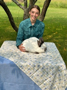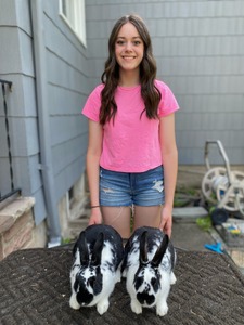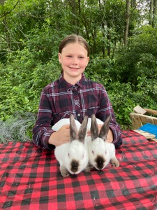 G21/G22-My name is Addison Keberle. I am 15 years old and in Dairy Club as well as Fur and Feather. This is my second year in the market rabbit program. This pair of meat rabbits are Satin New Zealand crosses and we're born on February 20th 2023. Both rabbits are females and fed on 18% protein pellets and timothy hay daily.