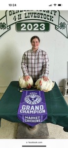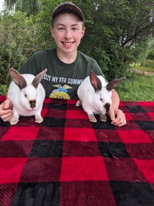 This is my 6th year doing meat chickens. I will be having 2 pairs of meat chickens. This year I raised 18 Cornish cross meat birds. We had the show on Saturday July 1st. I had one set that was 7th and the other set was 8th out of 39 pairs of birds. I bought them when they were a day old. I gave them turkey starter and fresh water and then I moved them outside and kept them on turkey feed and lots of fresh water. The last 3 weeks they were able to free range so they could get exercise and lots of fresh air. I am also selling a pair of meat rabbits they are Califarions does. I bought them when they were 7 weeks old. I have been feeding them 18% rabbit feed, hay and fresh water. I have not shown them yet. Our show is on Saturday July 22nd the first day of the fair. This is my second year doing the meat rabbit program. I would like to invite you to the Genesee County 4-H Market Animal Auction at the Genesee County Fairgrounds on Thursday. July 27th, 2023 at 6:30 pm in Batavia, NY. I hope you will consider buying one of my pairs of animals. I am saving my money to buy a compact tractor to use on the farm. Sincerely, Evan Winspear |