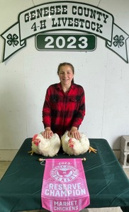 member of many different 4 H clubs within Genesee County for the last eight years. I am a member of the Market Poultry club this year which is raising Cornish Cross meat chickens. I worked hard to raise top quality meat birds. I learned how to care for the birds and make sure they were well fed and taken care of. I learned how important it is to take responsibility daily for the birds. At our recent live meat bird show my Broiler Pen earned Reserve Championship ranking. |
